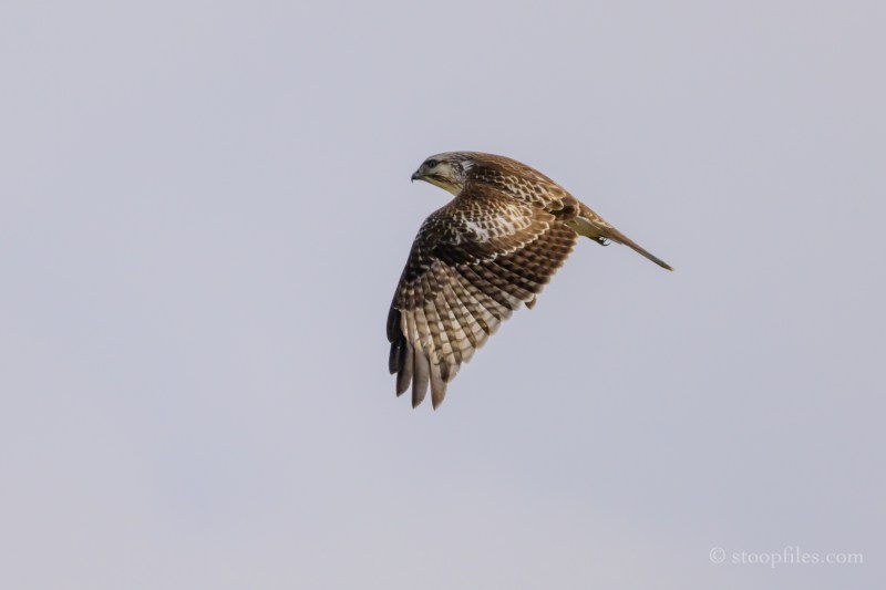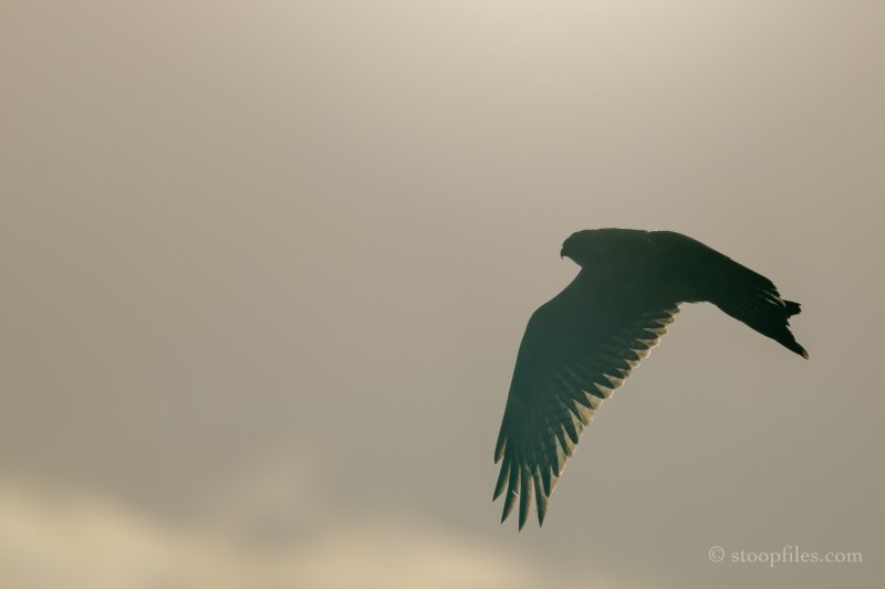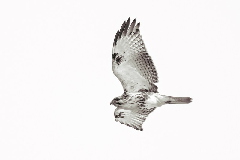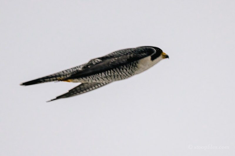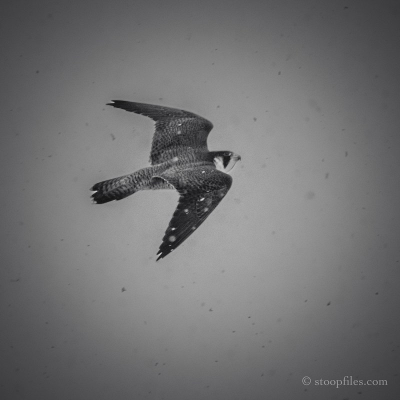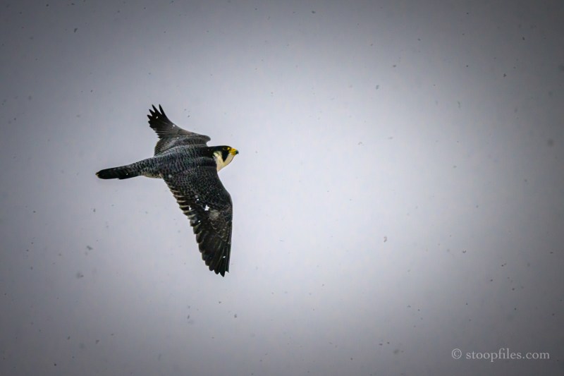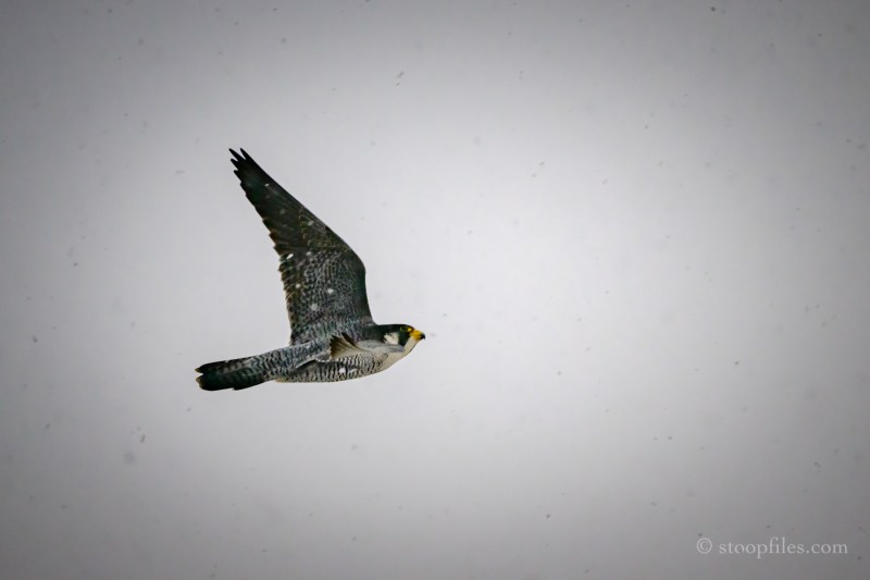 I was standing alone with a cold wind gust up against my back and snow flakes sparsely twirling about when a pigeon hurried right past my face. I barely had time to begin to inhale when this Peregrine appeared in front of me from the same direction. I managed to fire off just four frames; the first two – blank sky, the third this image, and the fourth, blank sky again.